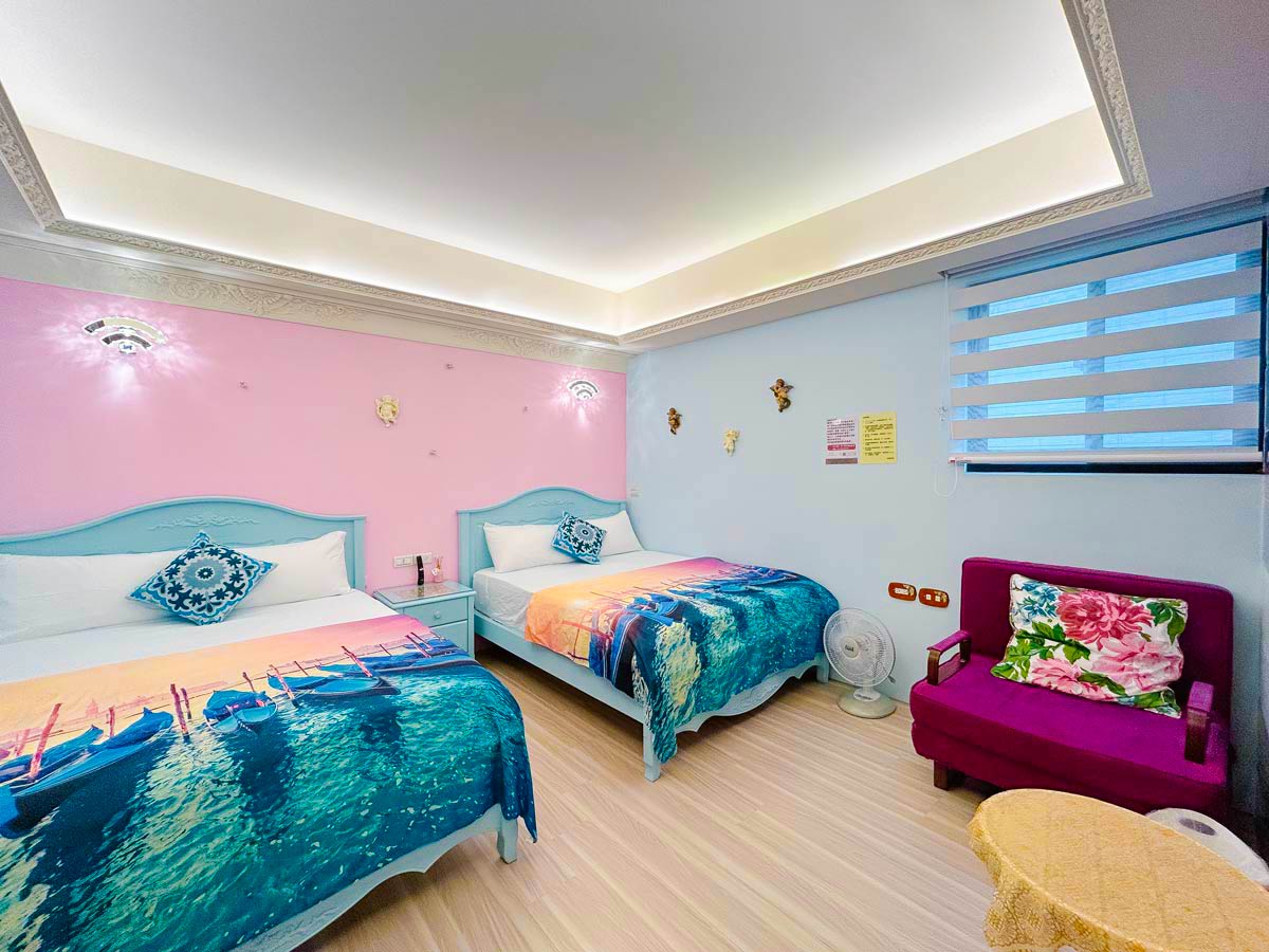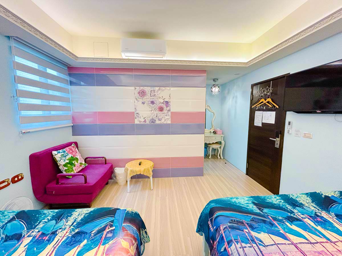 • 兩大床、分離式冷氣、液晶無線電視、吹風機、瓶裝水、免費無線WiFi、浴巾、洗髮乳和沐浴乳。